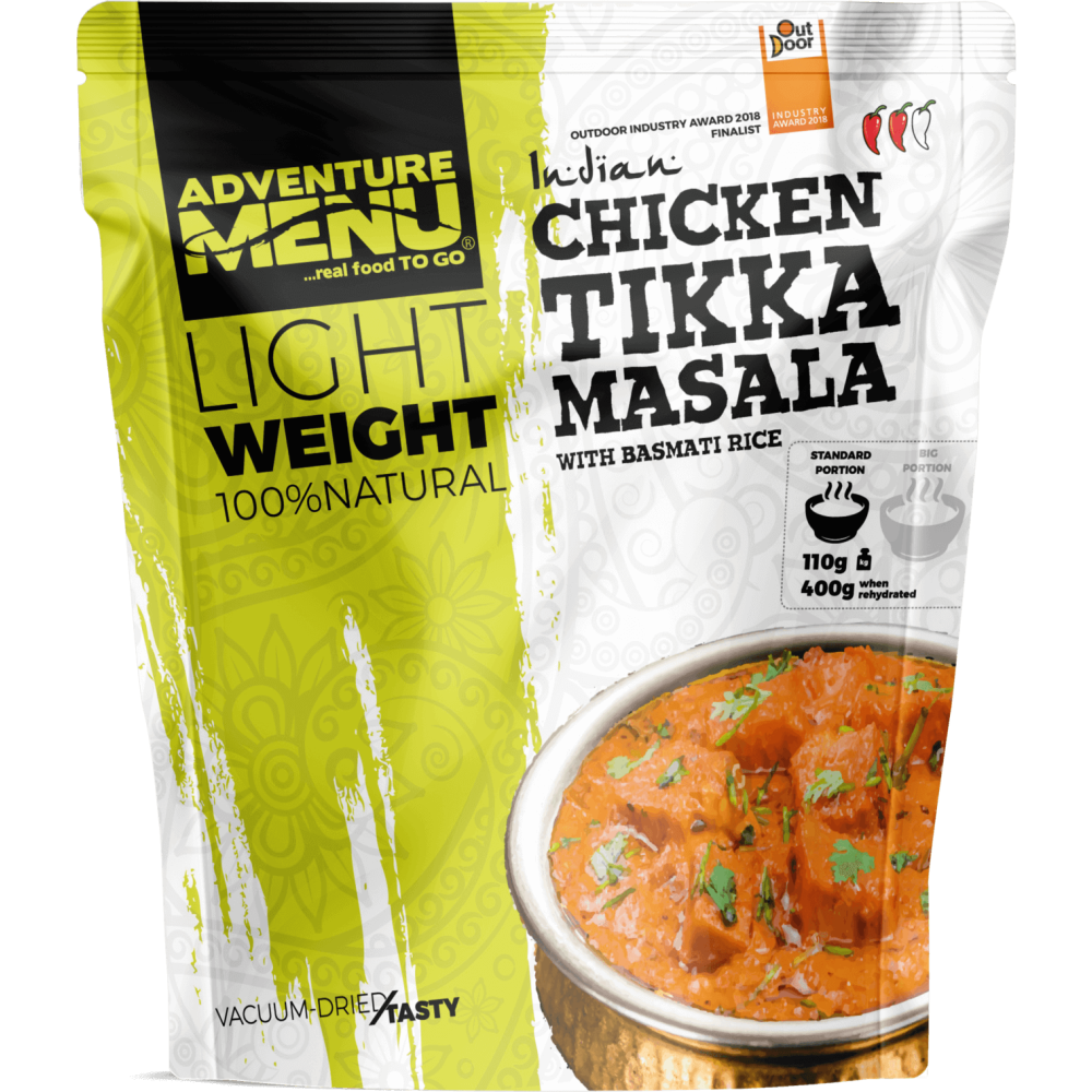 Délicatesse indienne Tikka Masala avec du riz basmati. Ce plat est conçu pour être porté sur le dos, ne pèse presque rien et fournit tout ce que votre corps et votre esprit demandent après une journée exigeante.